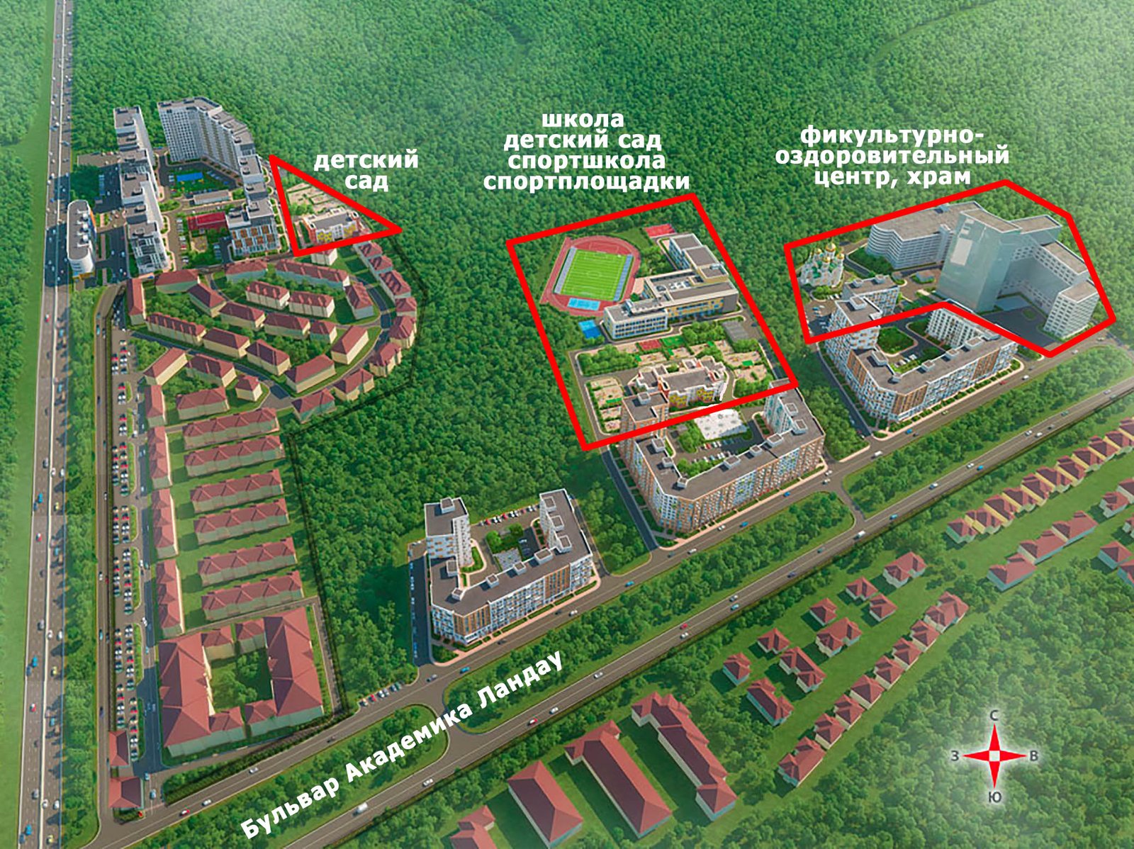 3) начать строительство социальных объектов (школы, детского сада, ФОКа) на бульваре Академика Ландау;
